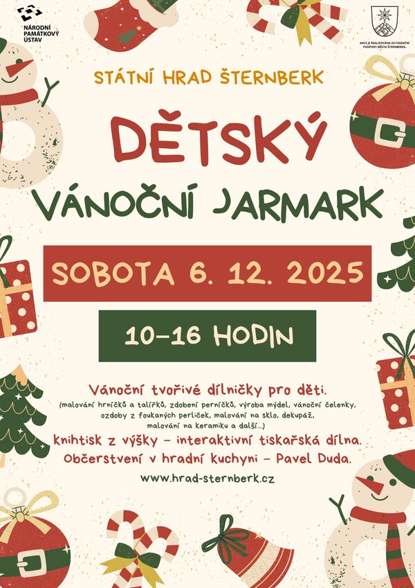 Oblíbenou adventní akcí na hradě Šternberk je tradiční DĚTSKÝ VÁNOČNÍ JARMARK, který se uskuteční v sobotu 6. 12. 2025. Začátek je naplánován na 10 a konec na 16 hodin.
